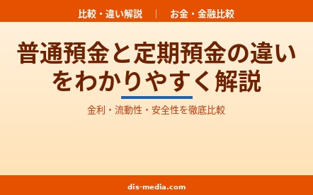 お金・金融比較普通預金と定期預金の違いを金利・流動性・元本保証・ペイオフなど8項目で徹底比較。2026年最新の金利データをもとに、あなたに合った預金の使い分け方をわかりやすく解説します。