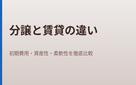 住まい・不動産比較「分譲と賃貸、結局どっちがいいの?」——あなたも一度は直面する、この大きな選択肢。結婚して子どもが生まれたとき、転勤の打診を受けたとき、定年後のライフプランを考えるとき。人によって、人生のステージによって、「正解」は大き...