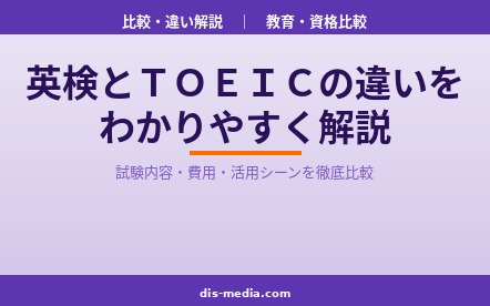 教育・資格比較英検とTOEICの違いを試験内容・スコア換算・費用・活用シーンなど7軸で徹底比較。大学入試なら英検、就職・転職ならTOEICが基本。あなたの目的に合った英語試験の選び方がわかります。